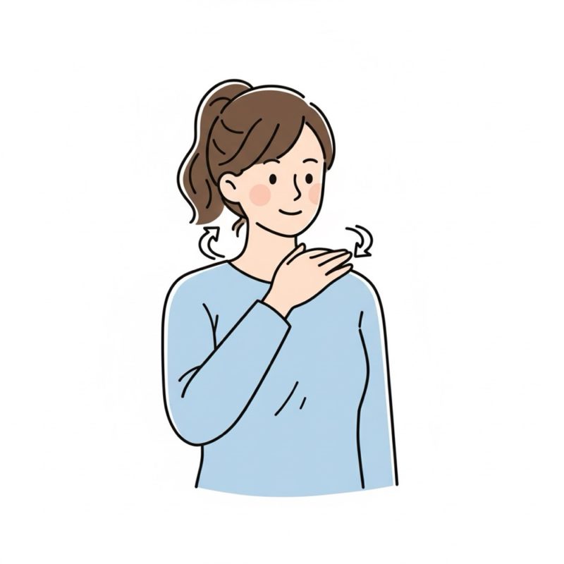 首を前後左右にゆっくり倒す 両手を頭の後ろに添えて、首の後ろをじんわり伸ばす 肩をすくめるように上に持ち上げてストンと落とす